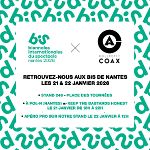 On January 21 & 22, the Collectif Coax team will have the pleasure of • welcome you to our stand (248) • invite you to the collective evening at Pol-N (5 minutes walk) for a series of concerts including Keep The Bastards Honest (Yann Joussein), on January 21 between 6 p.m. & 10 p.m. (rue des Olivettes) • meet you for a professional aperitif on January 22 at noon (stand 248).